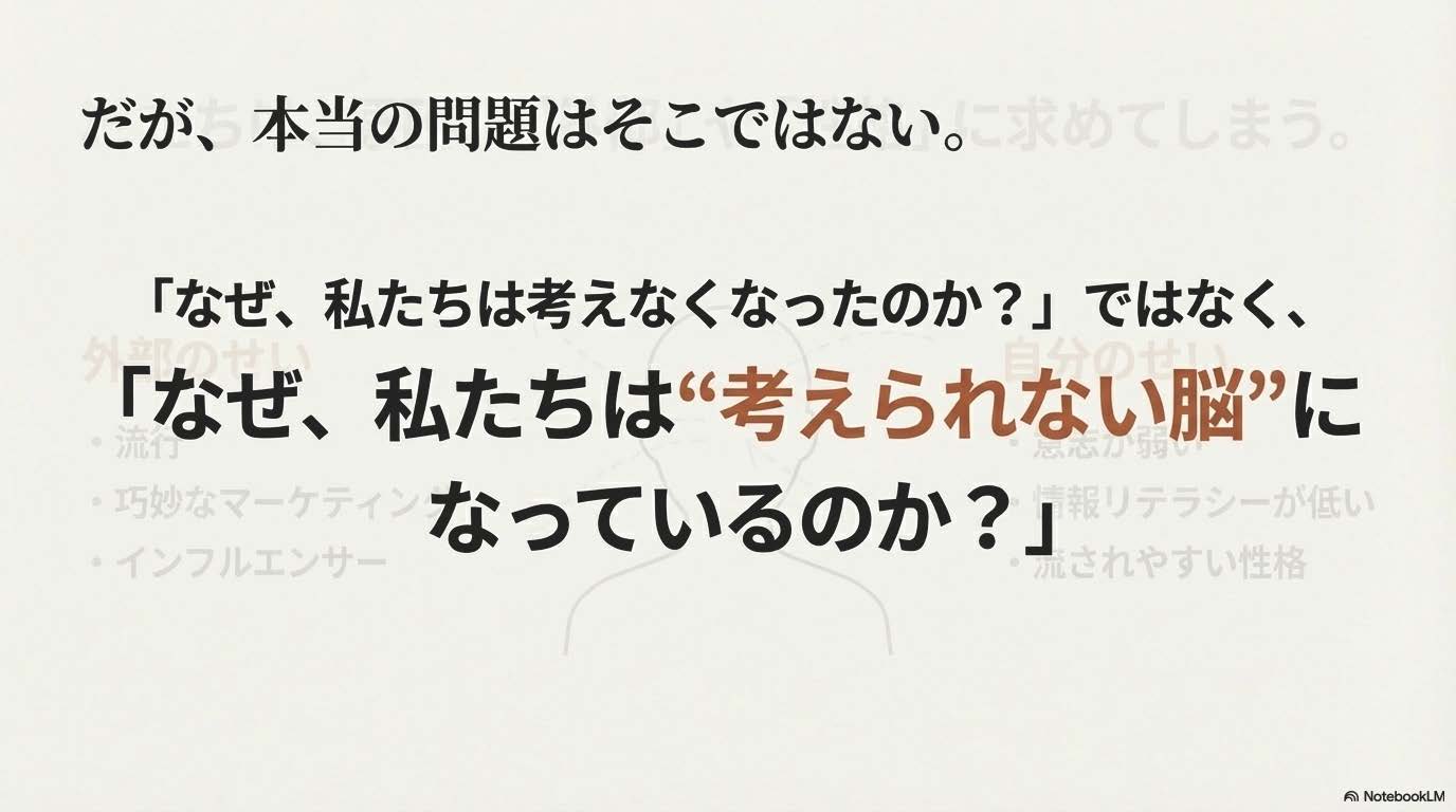 私が問題にしているのは、なぜ、私たちは自分で考えなくなったのかではなく、なぜ、考えられない脳の状態が当たり前になっているのかです。